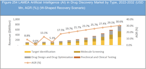Figure 256 LAMEA Artificial Intelligence (AI) in Drug Discovery Market by Type, 2022-2032 (USD Mn, AGR (%)) (V-Shaped Recovery Scenario)