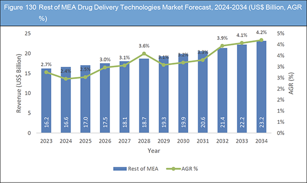 Figure 130 Rest of MEA Drug Delivery Technologies Market Forecast, 2024-2034 (US$ Billion, AGR %)