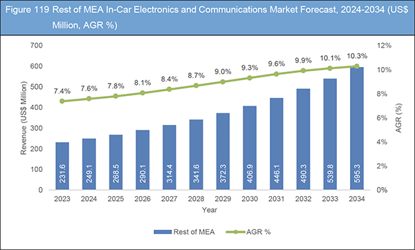 Figure 119 Rest of MEA In-Car Electronics and Communications Market Forecast, 2024-2034 (US$ Million, AGR %)