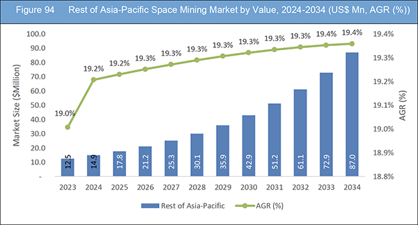 Figure 94 Rest of Asia-Pacific Space Mining Market by Value, 2024-2034 (US$ Mn, AGR (%))